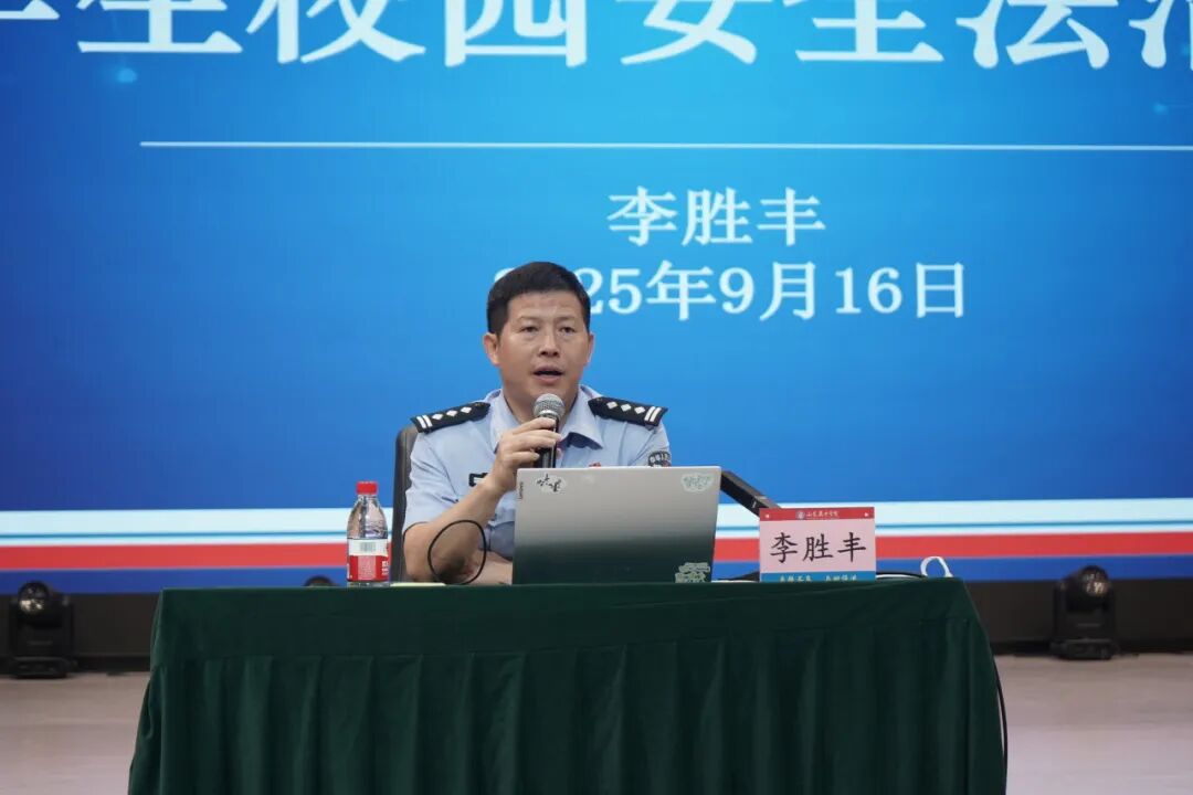 济南市公安局高新分局巨野河派出所一级警长、山东英才学院警务室驻校民警、学校法治辅导员李胜丰警官做了防范电信诈骗和防范打架斗殴的宣传,希望同学们提高法律意识和防范意识,自觉遵纪守法,学会运用法律保护自己,做一个知法、守法的合格大学生。