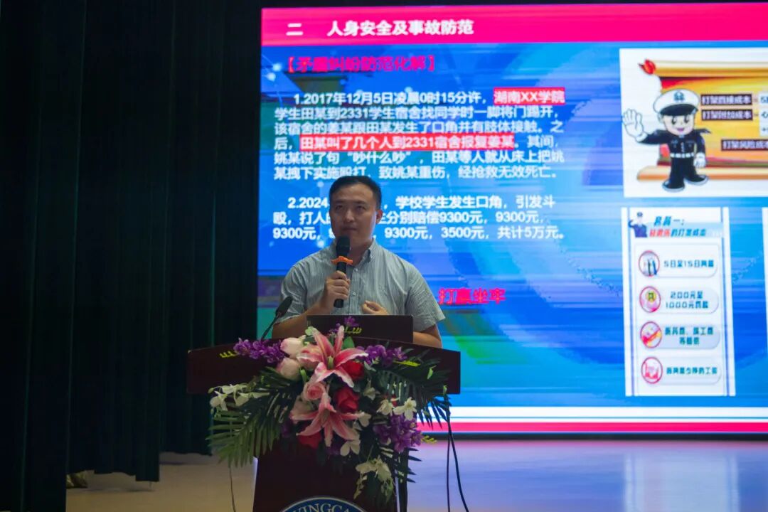 学校安全管理处处长朱良增为新生作了校园安全与法治专题培训。结合典型安全事故案例,他重点强调了人身、财产、消防、交通及自然灾害防范的重要性,并详细介绍学校“物防、人防、技防”三位一体的安防体系。朱处长希望同学们牢固树立安全意识,将“安全”二字内化于心、外化于行,共同维护校园安全稳定。