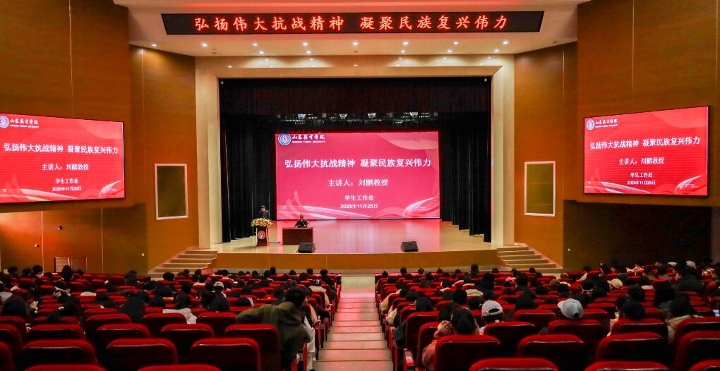今年是中国人民抗日战争暨世界反法西斯战争胜利80周年。为深入开展国防教育系列活动,突出国家安全意识,加强学校国防教育宣传,增强广大学生的国防意识,促使学生关注和了解国防建设,激发广大学生使命感和责任心,支持学生投身国防事业、勇担国防使命的家国情怀。学校分别于10月31日、11月25日邀请解放军原济南军区综合训练基地学生军训教研室主任、教授、刘鹏大校到南、北校区,为师生做《弘扬伟大抗战精神、凝聚民族复兴伟力》的报告。