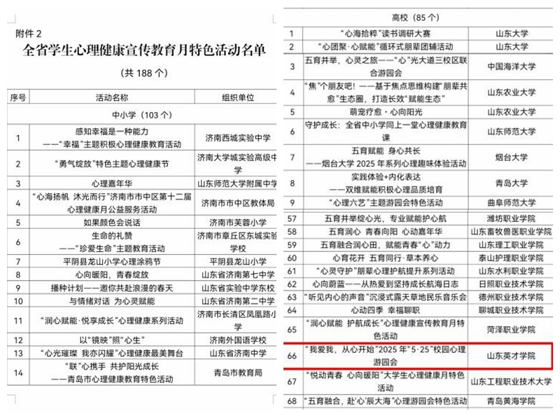 近日,山东省教育厅等4部门联合开展的2025年学生心理健康宣传教育月活动传来捷报——我校在高校组参赛通道中表现突出,成功实现“特色活动”与“典型案例”双项目入围!