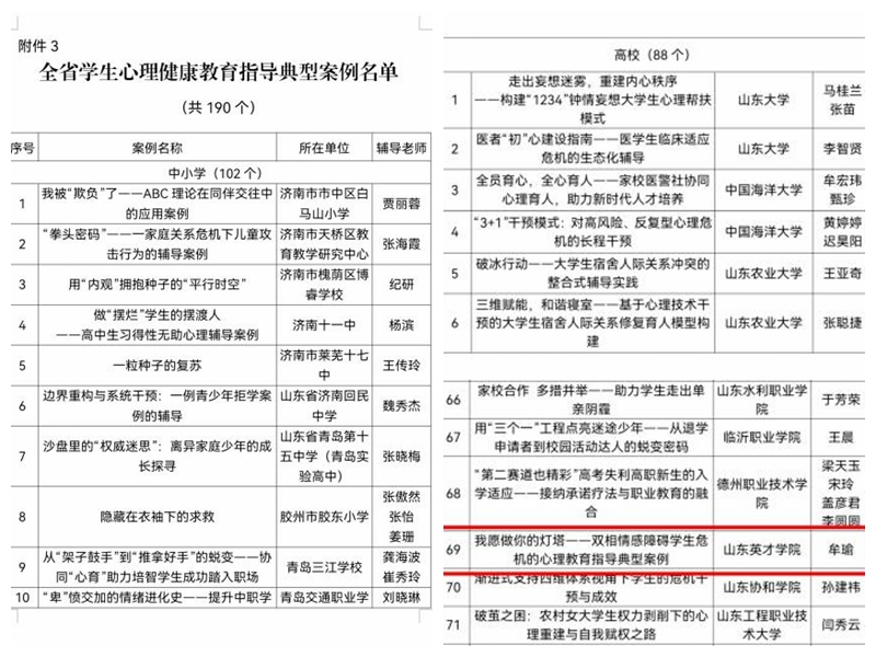 此次双项目入围不仅是对我校心理健康教育创新实践成果的肯定,更为学校后续深化心理健康教育体系建设提供了示范样本。未来,山东英才学院将以此为契机,持续优化心理健康教育工作,努力培育学生自尊自信、理性平和、积极向上的健康心态,为学生健康成长保驾护航,为全省学生心理健康教育事业发展贡献英才力量!