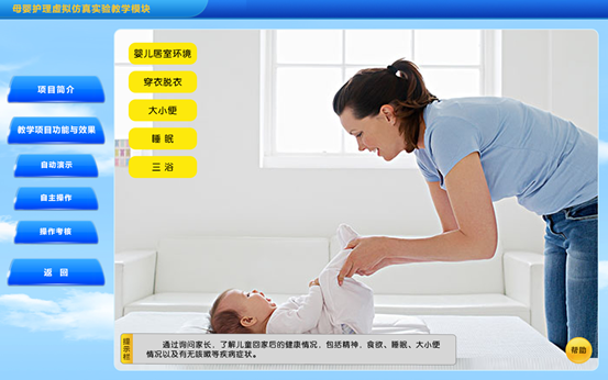 婴儿生活护理过程属于不可及实验,本实验教学项目利用虚拟仿真技术,模拟婴儿生活护理的全过程,展示婴儿生活护理中常用物品,引导学生根据不同环境选择合适的用物,并能熟练进行各项护理操作。该实验教学项目通过先进的信息技术,将不可及的实验虚拟再现,学生通过该项目形象直观地学习婴儿生活护理的要点。