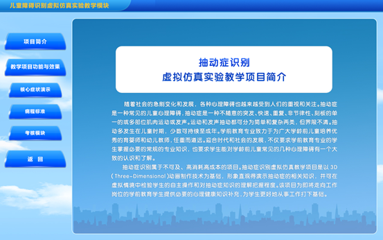 抽动症识别属于不可及、高消耗高成本的项目。抽动症识别虚拟仿真教学项目是以3D(Three-Dimensional)动画制作技术为基础,形象直观得演示抽动症的相关知识,并可在虚拟情境中检验学生的自主操作和对抽动症知识的理解把握程度。该项目为即将走向工作岗位的学前教育学生提供必要的心理健康知识补充,为学生更好地从事工作打下基础。