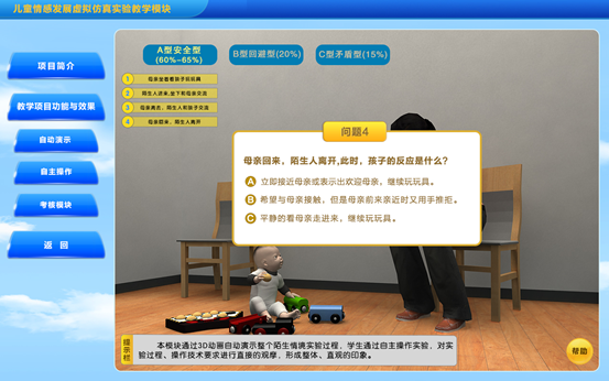 陌生情境实验属于高成本、综合实验,对实验操作环境和技术要求较高,操作不当会对婴幼儿造成一定的伤害。本实验采用flash动画技术再现陌生情境实验的全过程,利用3D技术使学生在虚拟仿真情景中自主的互动操作、检查,系统形象直观地掌握陌生情境实验的知识与技术,降低学习难度、增加实验真实性,为学生专业理论掌握和专业能力、创新能力培养提供帮助。