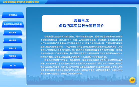 恐惧形成实验属于不可及、高危险实验,实验可能会对婴幼儿造成长时间甚至终身的伤害。本实验在告之学生不能在实际生活中进行此实验的同时,采用flash动画技术再现恐惧形成实验的全过程,利用3D技术使学生在虚拟仿真情景中自主的互动操作、检查,系统形象直观地掌握恐惧形成实验的知识与技术,降低学习难度、增加实验真实性,为学生专业理论掌握和专业能力、创新能力培养提供帮助。