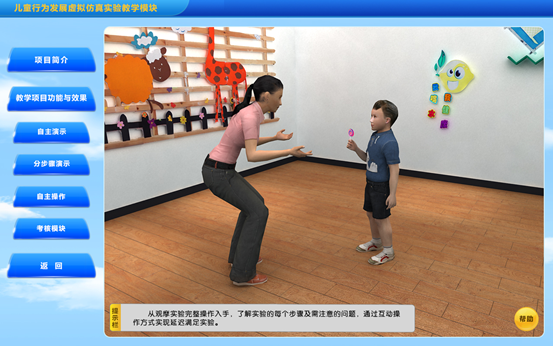 为延迟满足实验的每一步都设置一个虚拟的实验场景,步骤是连续的,所有步骤连接起来成为完整的实验过程。学生可以在虚拟真实的环境中直观系统的了解实验不同步骤的重点,帮助学生掌握延迟满足实验的实验室布置,在儿童进入实验室环境后,学生如何科学、准确使用无偏向的指导语,如何对儿童的反应进行观察记录等。为学生在系统了解实验的基础上提供一个详细的、分步骤的过程性学习机会,在高度仿真的环境中掌握实验的操作重点。