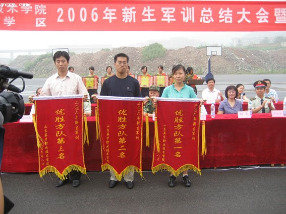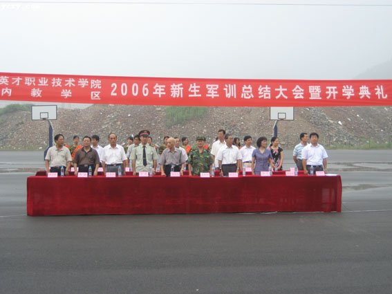 8月26日上午,山东英才职业技术学院校市内教学区2006级新生军训阅兵暨开学典礼隆重举行。学院名誉院长陈龙飞教授,党委副书记幸胜标同志,副院长赵喜臣教授,副院长张建琪副教授,副院长杨文副教授,院长助理孙启胜助理,长助理刘存刚博士及各二级学院的领导等出席观看了军训阅兵。