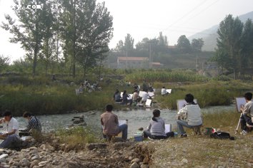 我们告别校园,向大自然出发,寻找设计创意。在汽车的鸣笛声中,我们挥手美丽的泉城,向写生地―峨庄、沂源出发。我们来到了大山里,早有老师为我们安排好了舒服的旅馆,使我们疲惫的心情得以放松,这里是一个风景优美,同时又有很多灵性的地方. 一个古老,淳朴的小村落尽管早上刷牙时会发现杯里居然有很多黑色不明浮游生物在悠然戏水而导致心情极度郁闷,尽管每天一成不变的伙食都是我们抱怨又无奈的对象,尽管……尽管生活条件上有许多不尽如人意的地方,可我还是很喜欢这里。这里有最原生态的风景,不巍峨,不婉丽,却别有一番小家碧玉的清新。。爱上这里不造作的风景,更爱上这里不造作的村民,沉默而又热情。他们不会没事就找你搭话,向你兜售一些物件;但当你有困难需要帮助时,他们又会很自然地伸出援助之手。写生中最令我难忘的莫过于大山群景、美丽的溶洞。山高林深、溪水清冽、地势起伏,空气特别清新无不令人心驰神往。本着追求“自然”的宗旨,幽静村庄与周围环境相协调,却别有韵致。沿着山径悠然而上,山石玲珑,溪水迤逦,经过木桥前行,因山形、地势各不相同,形成了风采、趣味各异的景观。
