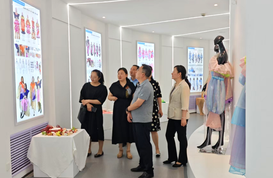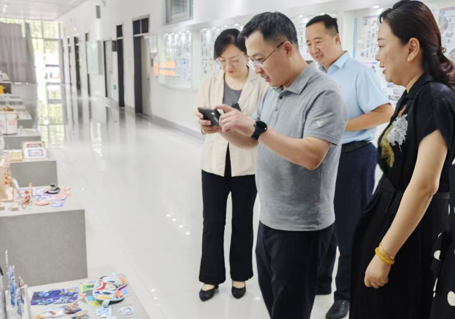 调研期间,张成旭主任一行在学院领导陪同下,实地考察设计学院设计综合实践教学中心。从学生原创的品牌设计作品、交互装置及多媒体影像等成果陈列有序,搭配3D打印设备、VR 虚拟仿真系统等前沿设施,全面展现学院“教学-实践-创新”三位一体的培养模式。这些项目引得来访嘉宾频频驻足,他们对学生作品的“创意落地性”与“市场适配度 给予高度赞誉。