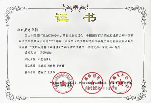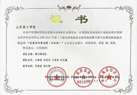 近日,山东省第七届校服设计大赛、2025年第十九届全国高校商业精英挑战赛文旅与会展创新创业实践竞赛(山东赛区)名单先后公布。山东英才学院的师生们凭借过硬的专业能力与创新实践素养脱颖而出,一举拿下6项省级竞赛奖项,其中山东省第七届校服设计大赛,获省级三等奖2项、优秀奖2项;第十九届全国高校商业精英挑战赛文旅与会展创新创业实践竞赛(山东赛区),获省级三等奖2项,2位教师荣获“优秀指导教师”称号,充分彰显了我校在时尚设计、文旅会展领域的教学积淀与人才培养硬实力。