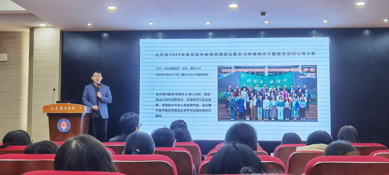 为深入贯彻落实新时代师德师风建设要求,切实提升教师思想政治素养与育人实践能力,12月2日,设计学院夏兆冬老师面向全院教师,分享参加山东省2025年高校青年教师思想政治素养与师德师风专题教育培训的,所学所悟与实践思考。此次培训由山东省教育厅主办、重庆大学承办,以“铸魂育人”为核心主题,为期四天的系统学习为教师成长注入了新动能。