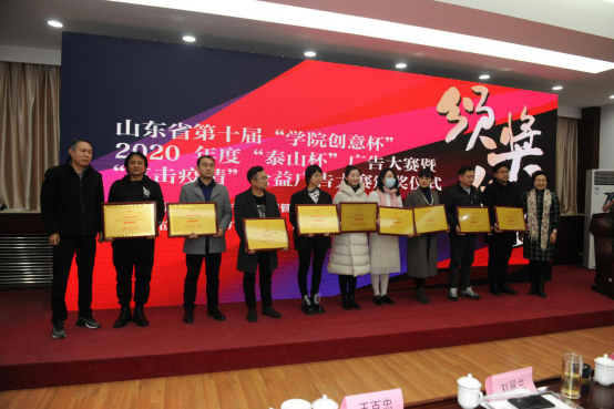 菏泽市市场监督管理局邬克伟、淄博市广告协会会长牛长辉、山东省国际广告有限公司总经理李勇为2020年度“泰山杯”广告大赛获奖代表颁奖。