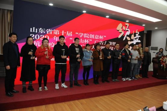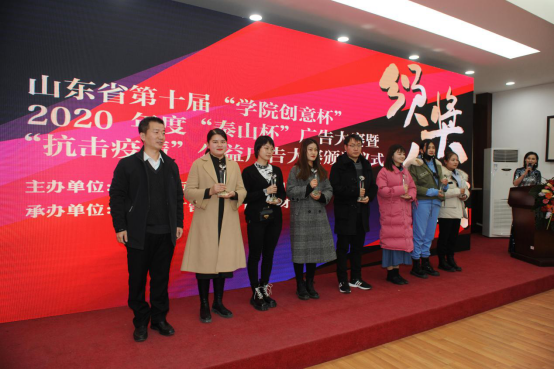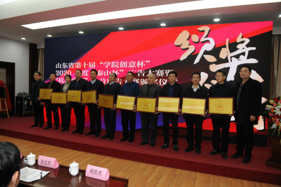 山东英才学院校长刘翠兰,山东广播电视台广告中心主任匡扬为荣获“学院创意杯”最佳组织奖单位颁奖。