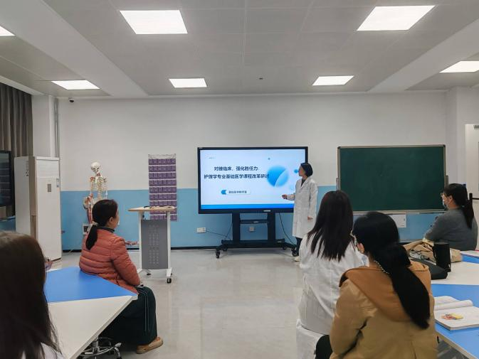 研讨中,教研室主任徐莉率先围绕“基础医学课程与临床护理场景的融合路径”展开分享。在模拟医学教室内,徐主任结合人体解剖模型、医学教学影像等教具,与教研室教师们深入探讨如何打破学科壁垒,从临床需求反向推导课程体系优化方向。徐主任强调:“基础医学是护理学专业的基石,要让学生在学习基础医学知识时,就能建立起与临床护理实践的关联认知,为后续临床岗位胜任力的培养筑牢根基。”