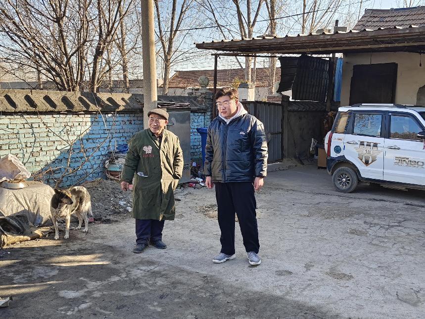 图为志愿者给老人晒被子