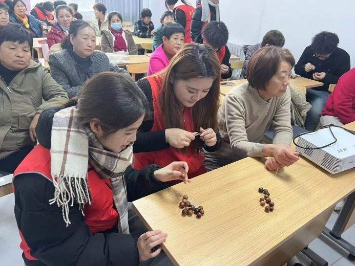 在志愿者的协助下老人们通过简单的工具和材料,亲手制作出手串,这一过程不仅锻炼了老人的动手力,更促进了与志愿者的距离,为老年人带去了关怀与温暖。