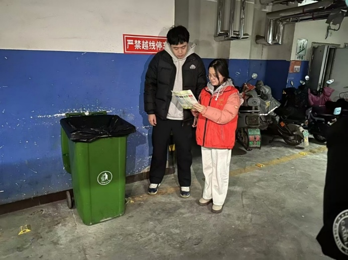 图为实践团成员与小区居民宣讲垃圾分类知识