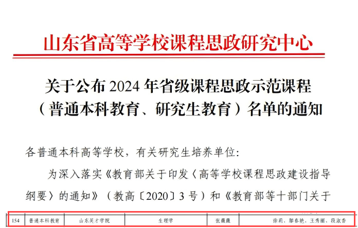 医学院《生理学》课程凭借其扎实的课程建设基础、巧妙的思政元素融入以及显著的教学成效,成功入选2024年省级本科课程思政示范课程。该课程在传授专业知识的同时,将思政教育巧妙地渗透其中,引导学生树立正确的价值观和职业道德观,真正实现了知识传授与价值引领的有机统一。